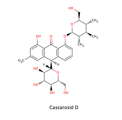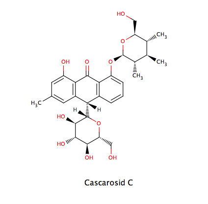 → C-Glykoside: Cascarosid A, B, C, D, Aloin A, B sowie Chrysaloin (= 11-Desoxyaloin)